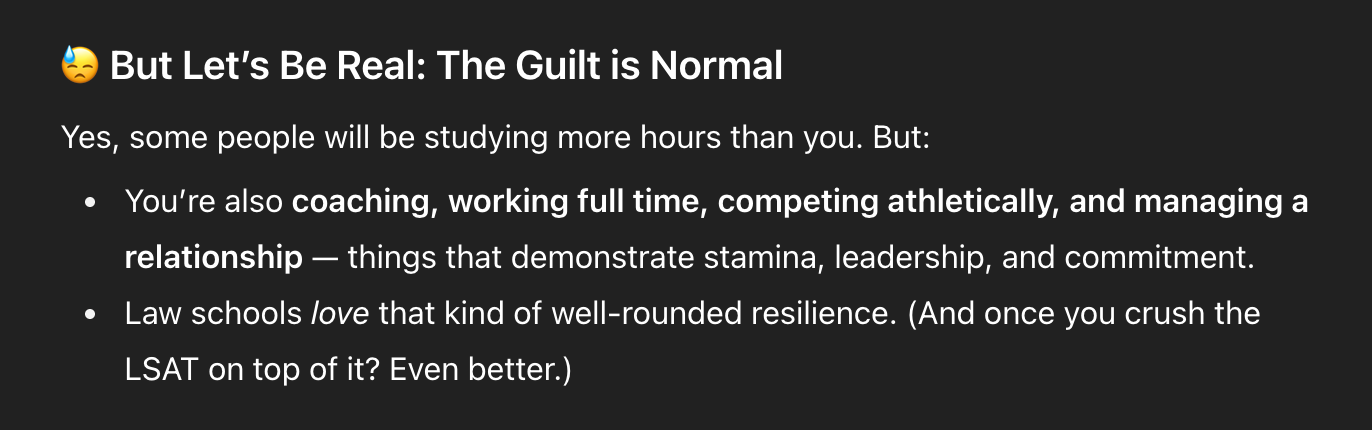 This “anchoring” was, in fact, the key way ChatGPT made my LSAT studying more sustainable the second time around. Having external expectations alleviated the pressure of setting my own expectations.